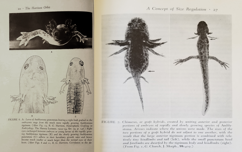 At the beginning of his career, while at Yale, Twitty worked under the embryologist Ross Harrison. Using a shard of glass as a scalpel, he performed “microsurgery,” excising all manner of body parts from embryos at different developmental stages and transplanting them to others. The team even made reciprocal tissue transplants across species, between embryos of the large tiger salamander and the much smaller spotted salamander. The resultant chimeras developed following the body plan like that of the species from which the tissue originate. So, tiger salamander with a spotted salamander’s forelimbs grafted on looks like a T-rex, and a spotted with eyes from a tiger salamander looks like a boggle-eyed anime cartoon. The creatures that arose from these studies contributed enormously toward advancing how we understand vertebrate development and stem cells.