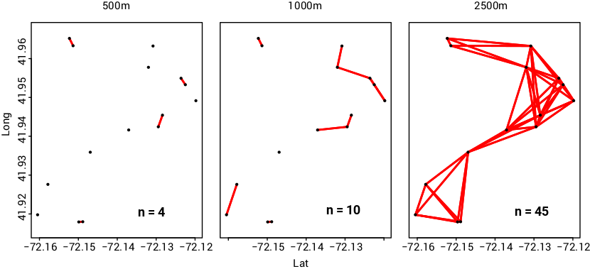 My strongest idea so far has been to display a pair-wise matrix with wright values in the lower triangle and geographic distance in the upper triangle. I ran an ANOVA on trait means by location and used the multiple Tukey HSD post hoc comparison p-values to assign a shading to significant divergence in the lower triangle. In the upper triangle, red shaded values indicate distances less than a 1000m dispersal kernels. The outlined squares in the lower triangle indicate significant divergence within a dispersal kernel, or microgeographic divergence as defined by Richardson et al. 2014. Since I’m not sure what an average dispersal distance might be, I ran the same analysis for 500m, 1000m, and 2500m (only the 1000m analysis is shown). To help illustrate the matrix, I’ve include a nearest neighbor joining spatial plot for each dispersal kernel distance (500m, 1000m, and 2500m).