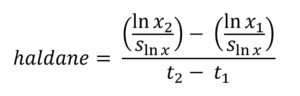 The darwin is a great unit if you are interested in long-term macroevolutionary change, but sometimes it falls short for certain questions. For instance, what if we wanted to compare the evolutionary rates of a tree and its insect pest? One limitation of the darwin that Haldane noted was that it doesn’t account for generation times. Over the order of millions of years, it probably is a wash, but if you are interested in short time windows, say 1000 years, generation times matter, especially when comparing a tree with 100 year generation time and an insect that reproduces annually. For this purpose, Philip Gingerich proposed a unit he dubbed the haldane.2 The haldane is similar to the darwin, but the rather than directly comparing mean trait values it compares trait values scaled to their standard deviation and rather than measuring time in millions of years, it measures time in generations. Here’s how it looks: