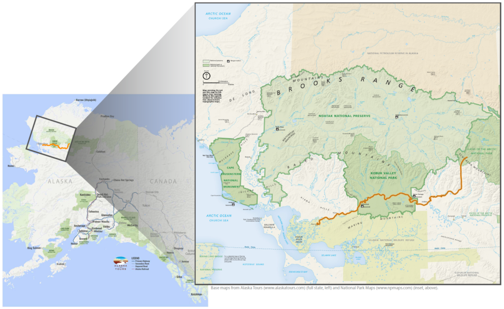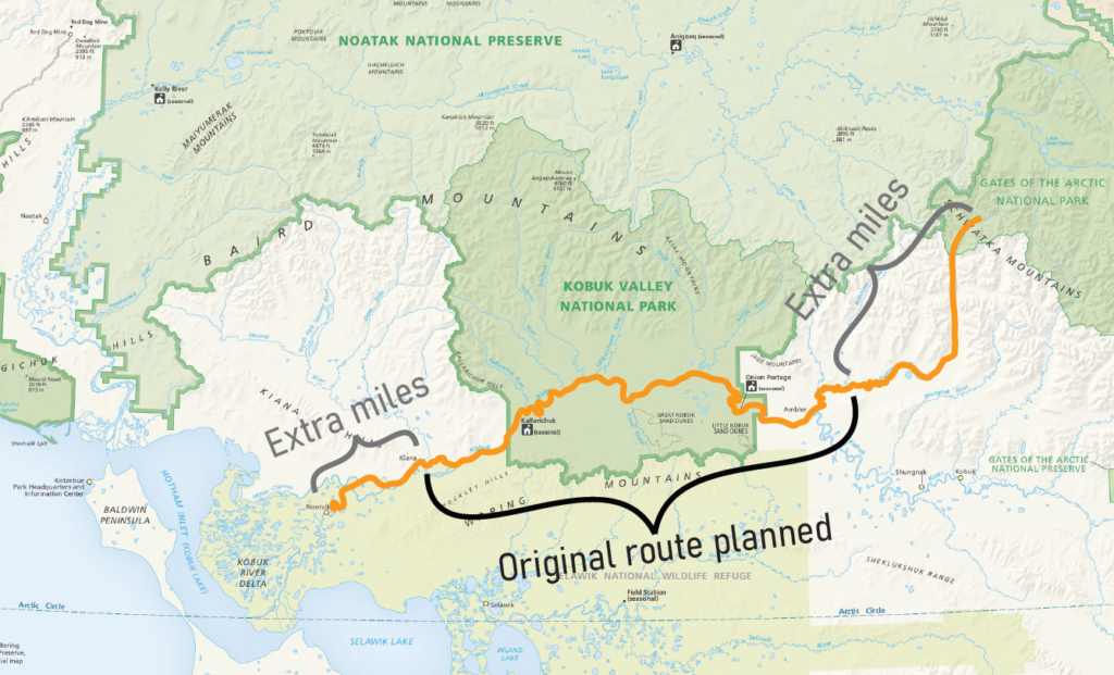 Our 200 mile route (in orange) from the headwaters of the Ambler River in Gates of the Arctic National Park, down the Kobuk River through Kobuk Valley National Park Wilderness, and out to the village of Noorvik where the Kobuk meets the Arctic Ocean.