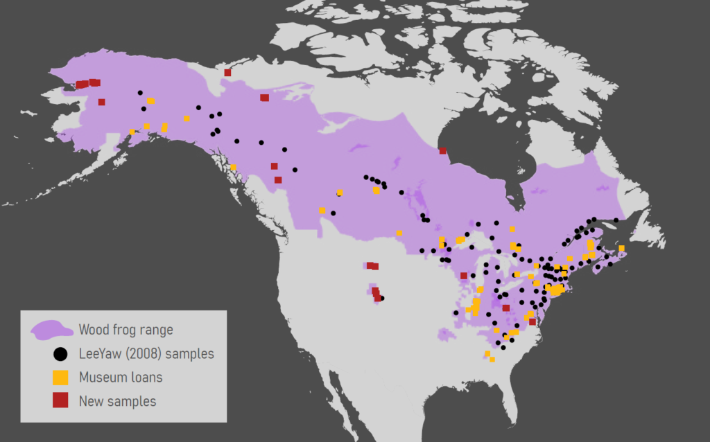 The other day, I wanted to tweet out a map showing the distribution of some wood frog tissue samples compared to the entire range of the species. I’m not much for GIS and I didn’t need anything complicated so I wanted to plot in R. If you find yourself in a similar situation needing to plot a simple range map with GGplot, then this post is for you.