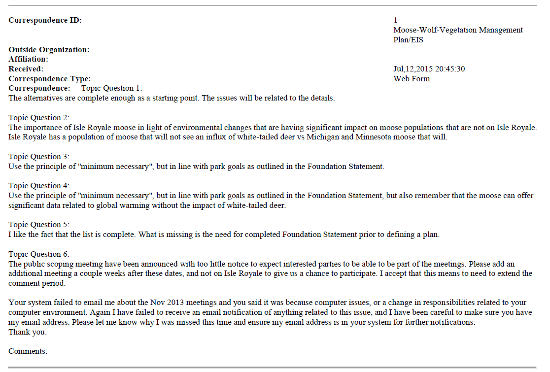The comments were submitted by a member of the public in response to the The Isle Royale National Park Moose-Wolf-Vegetation Management Plan/EIS. The Plan/EIS is a document that evaluates management alternatives for the moose and wolf populations on the island National Park land.