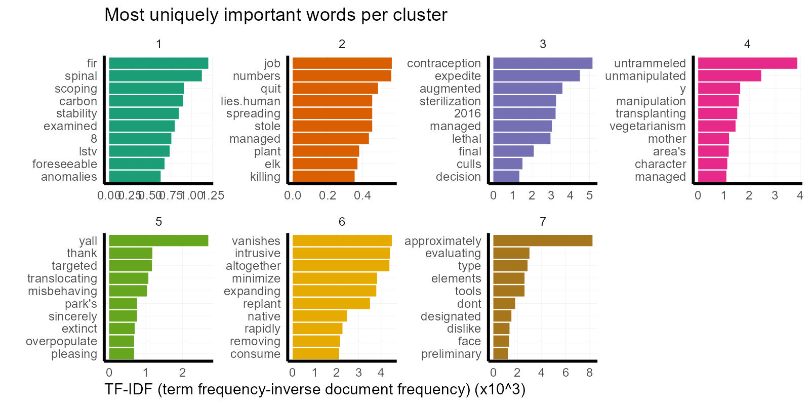 Cluster 3 seems to orient towards a topic of animal welfare, with words like, “contraception”, “sterilization”, “lethal”, and “culls”. I suspect that these comments speak to folks’ concerned less about the wolf population or wilderness management, and more about the ethics of any proposed action involving animals. In a similar way, it looks like Cluster 7 is more concerned with the science and measurement behind the management decision and less about the decision itself with words like, “evaluating”, “approximately”, and “tools” with high uniqueness and “management” as the most common word overall. These topics would have been completely lost if we had stopped at categorizing favored alternatives.