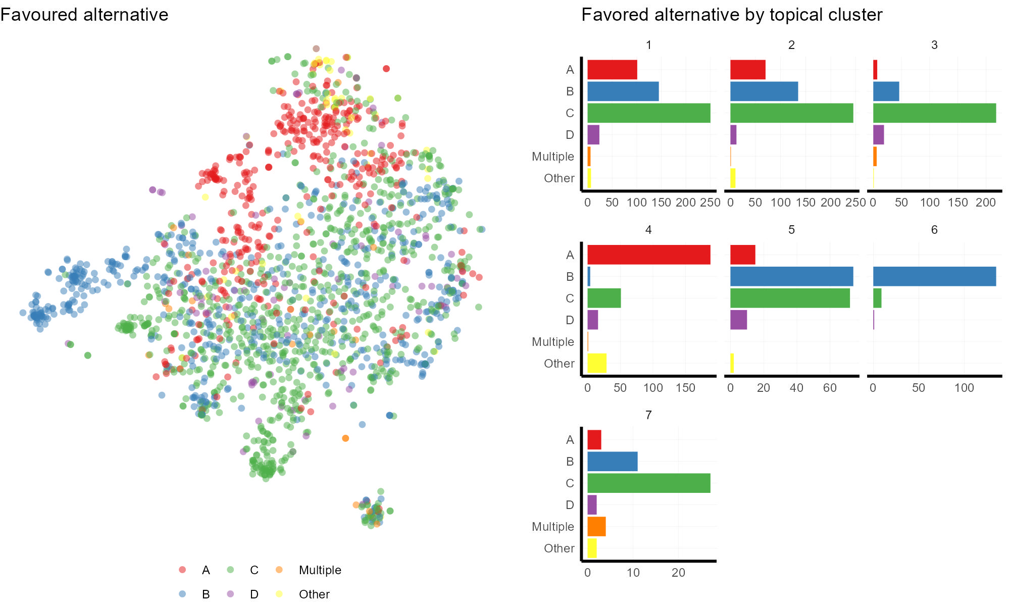 Cluster 7 and Cluster 3, are mostly skewed to Alternative C – more monitoring, but exhibit very similar distributions. This might be a great example where even folks who tend to agree on the same Alternative, do so for different reasons–a pattern we would have totally missed without text analysis.