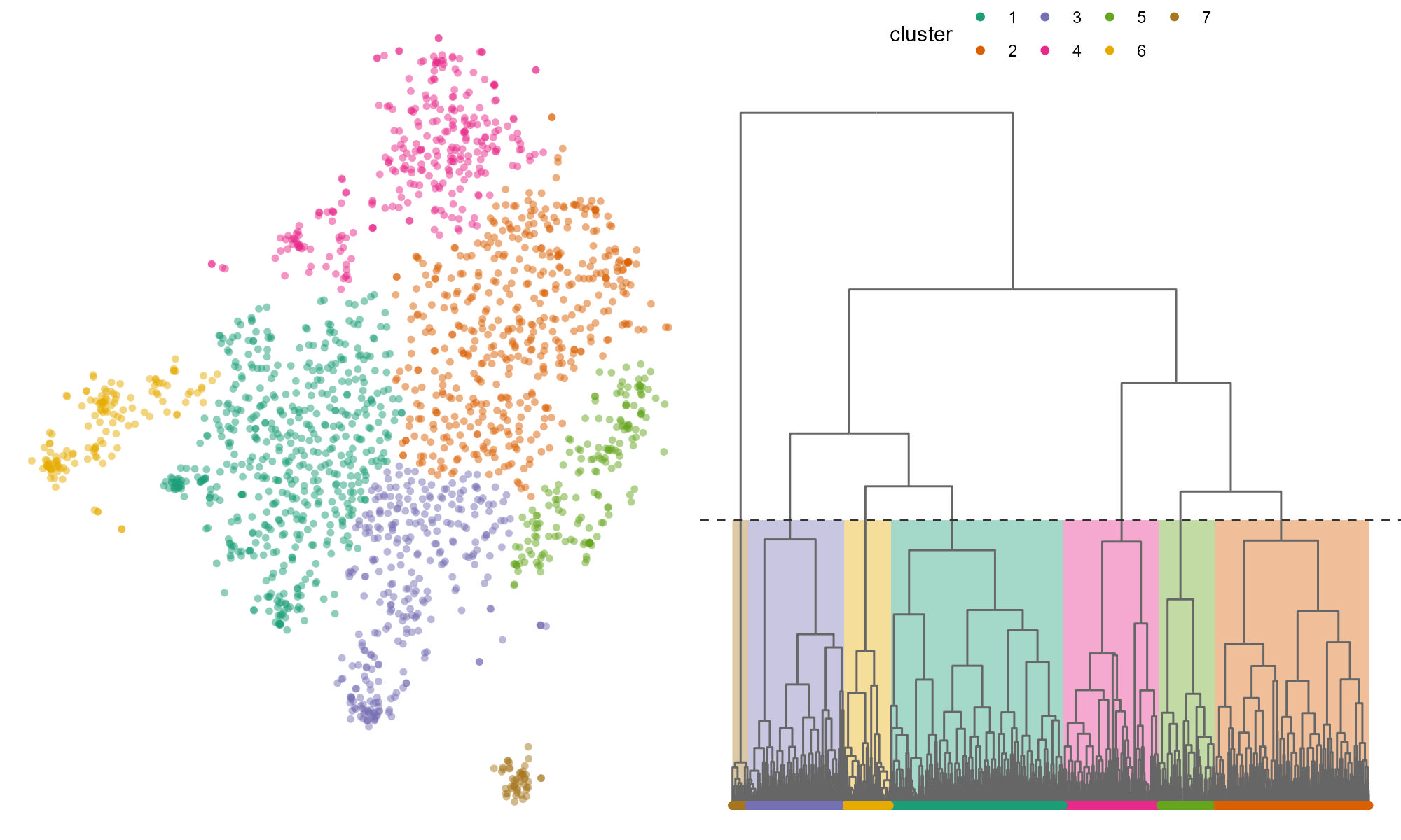 Since we are clustering on tSNE dimensions where distance doesn’t really matter, deciding where to set our breakpoint is a personal choice. I’ve decided to use 7 clusters because it seemed a natural breakpoint and recovered the obvious clusters.