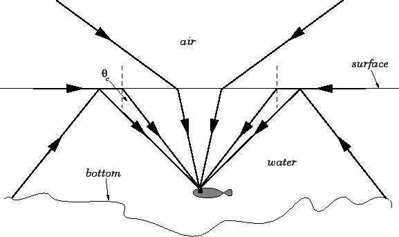 Image: Figure demonstrating the refraction angle of light at the water's surface as seen by fish; by Richard Fitzpatrick, University of Texas.< \span>
