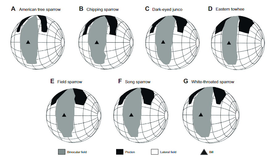 Image: Fig. 3. from Moore et al. 2015: Orthographic projection of the boundaries of the two retinal fields around the head of an animal while the eyes are in a resting position. (A) American tree sparrow, (B) chipping sparrow, (C) dark-eyed junco, (D) Eastern towhee, (E) field sparrow, (F) song sparrow and (G) white-throated sparrow. Values are averaged across all individuals measured per species. A latitude and longitude coordinate system was used with the head of the animal at the center of the globe. The grid is set at 20 deg intervals and the equator aligned vertically in the median sagittal plane (the horizontal plane, 90–270 deg). The projections of the pecten produce a blind spot in the upper, frontal field. Projections of the bill tips are presented for orientation purposes.